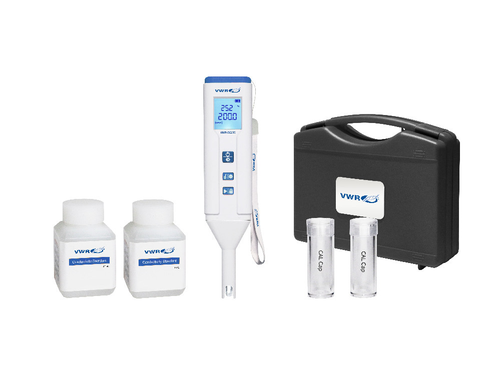 Replaceable electrode |, 11_Delivery: | Tester includes: Carrying case, wrist strap, conductivity standards (1413 µS/cm and 10.85 mS/cm), calibration bottles, AAA batteries (4). |, Model: E-EC100, Parameter: Conductivity/TDS/Salinity/Resistivity, | The VWR 100-series conductivity pocket tester is a complete system for conductivity measurements on the go. |, The easy to use VWR-EC100 Pocket Tester provides the flexibility of measuring conductivity, TDS (total dissolved solids), resistivity and salinity all with a single tester. The rugged carrying case allows you to easily transport the pocket tester, buffers and accessories to any location. Easily switch out the electrode to help prolong the life of the pocket tester. |, 02_BulletPoint: | High resolution LCD display |