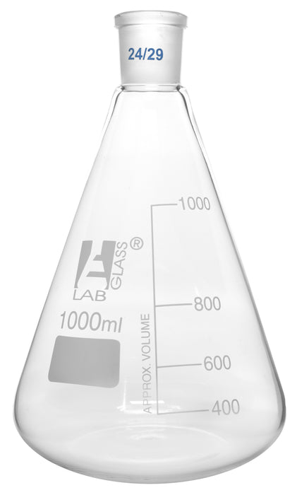 This 1000ml conical flask is made of high-quality Borosilicate glass and features a narrow neck to prevent spills. The flask has an interchangeable joint with a 24/29 socket size and white graduation lines marked every 200ml from 400ml to 1000ml. It is perfect for any science or home laboratory setting. Note that no stopper is included. The flask stands 8.25 inches tall and has a base measuring 5.25 inches in diameter.