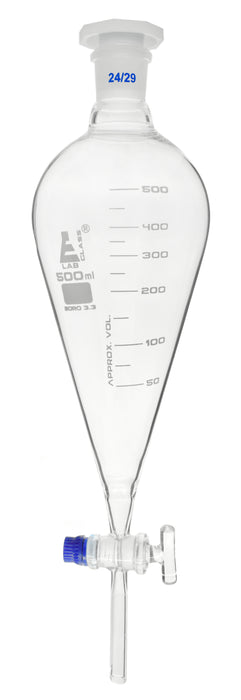 500ml capacity separating funnel, made of high quality borosilicate glass. Funnel has a 24/29 size socket and includes an interchangeable plastic stopper. Glass key stopcock. White graduations, every 50ml, and marked every 100ml. This funnel (including stem) measures 14" tall, and has a diameter of 4". The stem measures 2.25" tall and has an inner diameter of 6mm and outer diameter of 9mm.