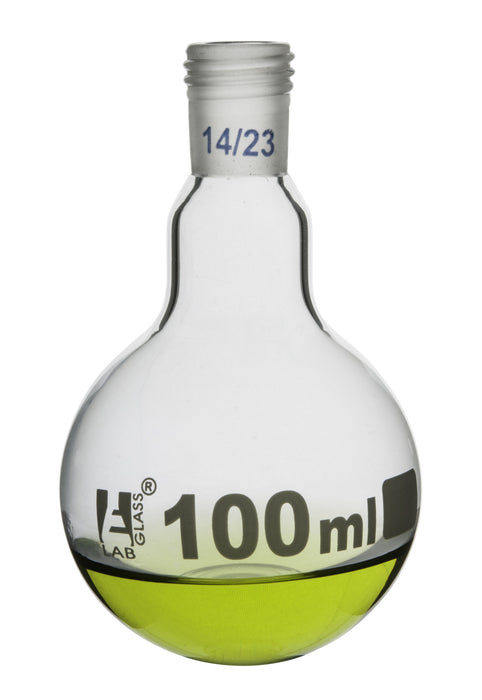 This product features a round-bottom borosilicate glass container with a screw thread. It has a capacity of 100ml and a socket size of 14/23.