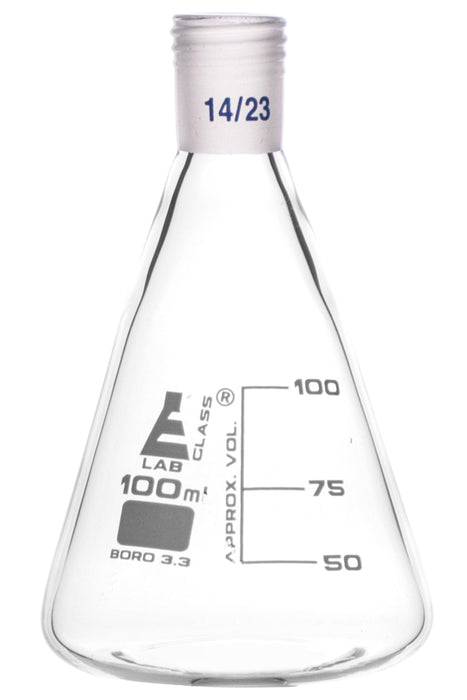 Erlenmeyer flask made of high quality, heavy duty borosilicate glass. 100ml capacity with 25ml graduations. Interchangeable joint with socket size 14/23. Flask measures 4.25" tall and has a base diameter of 2.5".