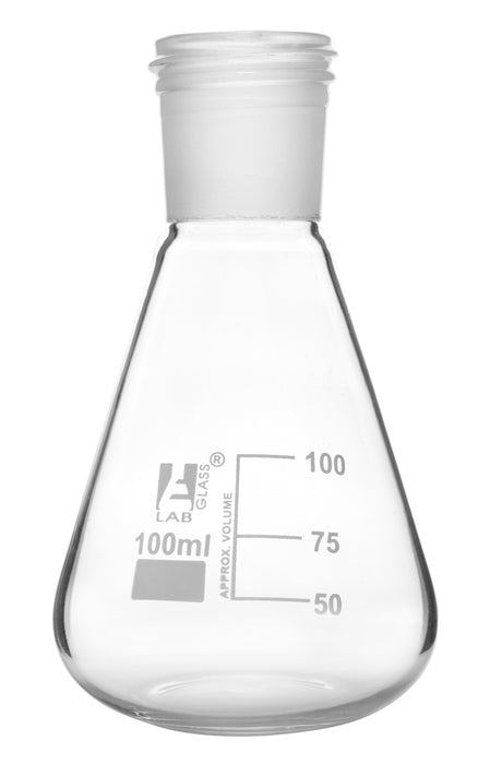 100ml capacity boiling flask made of high quality, heavy duty borosilicate glass. Screw thread joint. Socket size 24/29. No stopper included. Flask measures 4.5" tall, and is 2.5" in diameter.