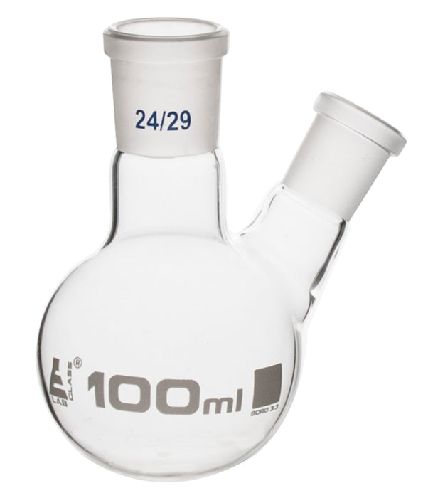 Distilling Flask made of high quality, heavy duty, 3.3 borosilicate glass. 100ml capacity. Oblique neck with 24/29 socket size joint. Side socket is size 14/23. 4" tall, 2.5" wide at widest point. Eisco Labs Borosilicate glass has the following heat tolerances: Strain Point -515°C | Annealing Point 565°C | Softening Point 820°C