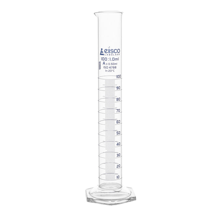 100ml graduated measuring cylinder made of high quality, heavy duty Borosilicate 3.3 glass. Spout for easy pouring, and hexagonal base for extra stability. Class A tolerance, ±0.50ml as per DIN EN ISO 4788 standard. Blue printed graduations and specifications. 1ml subdivisions. Cylinder stands 9.75" tall, with a base measuring 2.9" wide. Inner diameter of cylinder body measures 29mm (1.1"), and outer diameter measures 32mm (1.25"). Autoclavable, with superior chemical durability. Low temperature gradient- can withstand high temperatures & thermal shocks. Eisco Labs Borosilicate glass has the following heat tolerances: Strain Point -515°C | Annealing Point 565°C | Softening Point 820°C. Calibrated to contain.