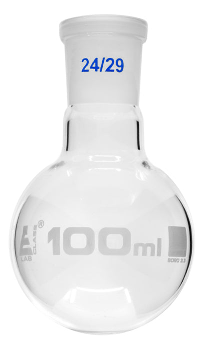 Made of high-quality, heavy-duty borosilicate glass, this 100ml capacity boiling flask is perfect for any science or home laboratory. It features a single, interchangeable joint with a 24/29 size socket. Please note that no stopper is included. The flask stands 4.25" tall, with a neck measuring 1.3" wide and a bottom diameter of 2.5". Eisco Labs' borosilicate glass has the following heat tolerances: strain point -515°C, annealing point 565°C, and softening point 820°C.