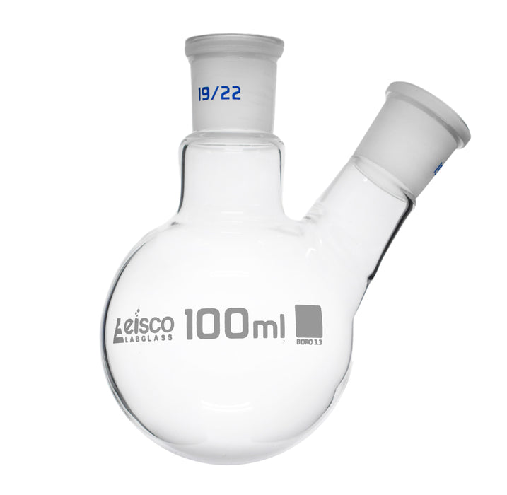 100mL Boiling Flask with 2 Necks is made of high quality, heavy-duty borosilicate 3.3 glass conforming to USP Type I and ASTM E438 Type I, Class A requirements. Necks have standard ground joints with 29/32 size sockets for connecting to glassware and equipment to transfer liquids and gase