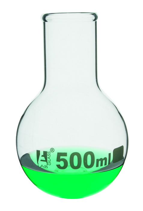 100ml Round bottom wide neck boiling flask made of high quality Borosilicate 3.3 glass. Inside diameter of wide mouth is 1 -1/8" (28.58 mm) . Diameter of flask is approx. 2 3/8" (60.3mm). Thick Beaded Rim. Clamp Not included - Used for holding imaging purposes. This clamp can be purchased by searching PRCMP08BH.Eisco Labs Borosilicate glass has the following heat tolerances: Strain Point -515°C | Annealing Point 565°C | Softening Point 820°C.