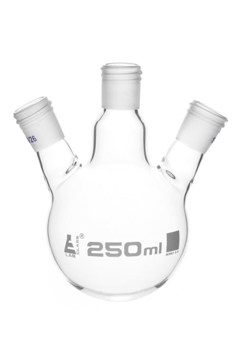 250ml capacity distillation flask with three necks. Made of high quality, heavy duty borosilicate glass. Interchangeable, screw thread joints. Socket size 19/26. Flask measures 5.5" tall, 3.5" width at the widest point.