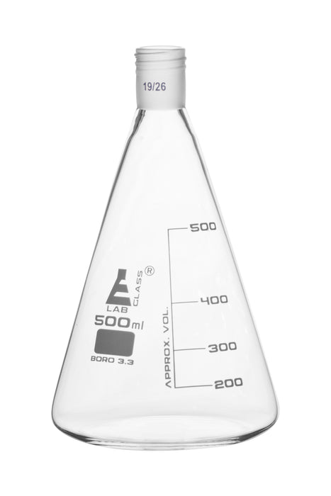 Erlenmeyer flask made of high quality, heavy duty borosilicate glass. 500ml capacity with 100ml graduations. Interchangeable joint with socket size 19/26. Flask measures 7" tall and has a base diameter of 4".