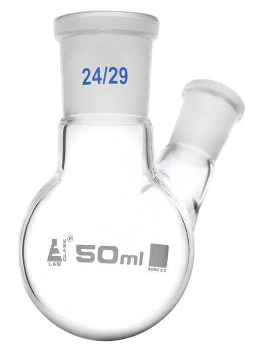 50ml capacity, round bottom distilling flask made of high quality, heavy duty 3.3 borosilicate glass. 24/29 oblique neck, with 14/23 side joint. Flask stands 3.75" tall, and has a total width of 3". Base diameter measures 2". Neck measures 1.1" in diameter, side neck measures 0.75" in diameter.Autoclavable, with superior chemical durability. Low temperature gradient- can withstand high temperatures & thermal shocks. Eisco Labs Borosilicate glass has the following heat tolerances: Strain Point -515°C | Annealing Point 565°C | Softening Point 820°C.