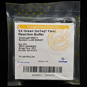 Buffer^ 5X Green GoTaq* Reaction Buffer, Form: Fluid, Contains: two dyes (a blue dye and a yellow dye) that separate during electrophoresis to show migration progress, Pack Size: 20ml