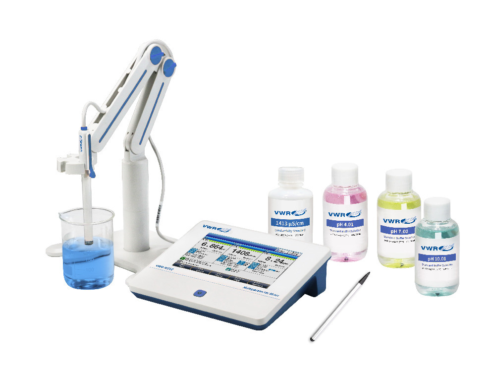 Support for RS232 and USB communication |, 11_Delivery: | Three-year meter warranty. All meters include: In use cover, electrode stand and touch screen pen. For application specific recommendations, please reference 'VWR® Electrode Selection Guide' located in the Related Information section. |, VWR-M950 meter includes PH31 pH electrode, pH buffers (4.01, 7.00, 10.01) 50 ml bottles, EC01 conductivity electrode k=1, and conductivity standard 1413 µS/cm 50 ml bottle, Model: VWR-M950A, | The VWR-M950 benchtop multi-parameter meter provides accurate and reliable measurements of pH, conductivity, ion concentration, and dissolved oxygen. |, The easy to use VWR-M950 benchtop meter provides the ability to perform various measuremetn parameters such as pH, TDS, ORP and Dissolved Oxygen with a single meter. The intelligent operation system provides features including user managment, calibration management, electrode management, method management, and many other advanced capabilities. Connect the meter easily to the VWR Dot Matrix Printer (10799-132) to print measurement reports. |, 02_BulletPoint: | High resolution color touch display (7.0") |