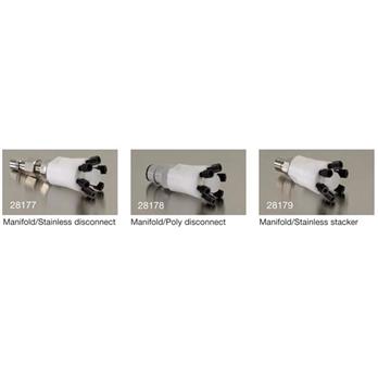 The HPLC Poly Manifold enables up to six waste lines (per manifold) from HPLC processes to be fed into a single intake fitting. Manifolds have six 1/4-28 ports and one 3/8 " NPT port (all come with caps for unused ports) and either one quick disconnect in No. 316 stainless steel or polypropylene, or a No. 316 stainless steel stacker connector. The six ports are tapped to accommodate the 1/4-28 threads of the separately available compression fittings.The compression fittings, sold in sets of six, accommodate tubing sizes of either 1/16 " and 1/8 " OD. The fittings are approximately 1 " long and made of Tefzel™. They include ferrules for a compression fit to the waste line.Manifold #28179 has a "stacker " connection enabling it to attach on top of a #28177 or 28178 and allowing up to a total of 12 waste lines to be fed into the disposal can. Multiple manifolds may be used on a custom-designed Quick Disconnect container as long as one disconnect remains unused to permit venting and prevent back pressure. Safety Can with Manifold installed is OSHA complaint and meets NFPA Code 30.