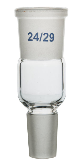 This Expansion Adapter can be used to connect lab equipment with different size joints. Made from high quality, heavy duty borosilicate glass. Socket size 24/29. Cone size 14/23. Overall length of 3.5"