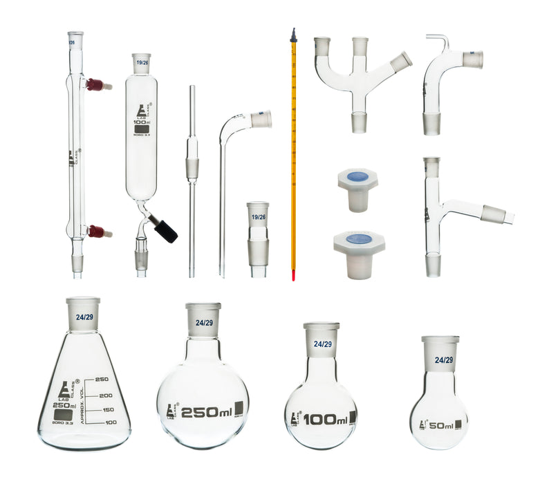 This comprehensive set is ideal for organic chemistry labs, distillation, fractional distillation, separation, purification, and synthesis. It consists of: a Liebig condenser, dropping funnel, reduction adapter, air leak/steam inlet, receiver adapter, multiple adapter, 250ml Erlenmeyer flask, 250ml round-bottom flask, 100ml round-bottom flask, 50ml round-bottom flask, two stoppers (19/26), socket cone, one stopper (24/29), and a thermometer. All pieces are made of high-quality, 3.3 borosilicate glass that is hand-blown and polished for a perfect fit. Our E-Lab glass guarantee ensures that any piece broken during shipping will be replaced free of charge. Note: Metal ware stands are not included in the set; we recommend using Eisco's MTST1 stand. This set features autoclavable, superior chemical durability, and a low temperature gradient, allowing it to withstand high temperatures and thermal shocks. Our borosilicate glass has the following heat tolerances: strain point -515°C, annealing point 565°C, and softening point 820°C. At Eisco Labs, we proudly manufacture our own products using state-of-the-art equipment and adhere to the highest standards of quality control. Each product is carefully designed by a team of laboratory professionals and experienced engineers with quality and durability in mind. We use only the highest-grade raw materials and follow international quality standards to ensure that our products can withstand use in even the toughest laboratory environments.