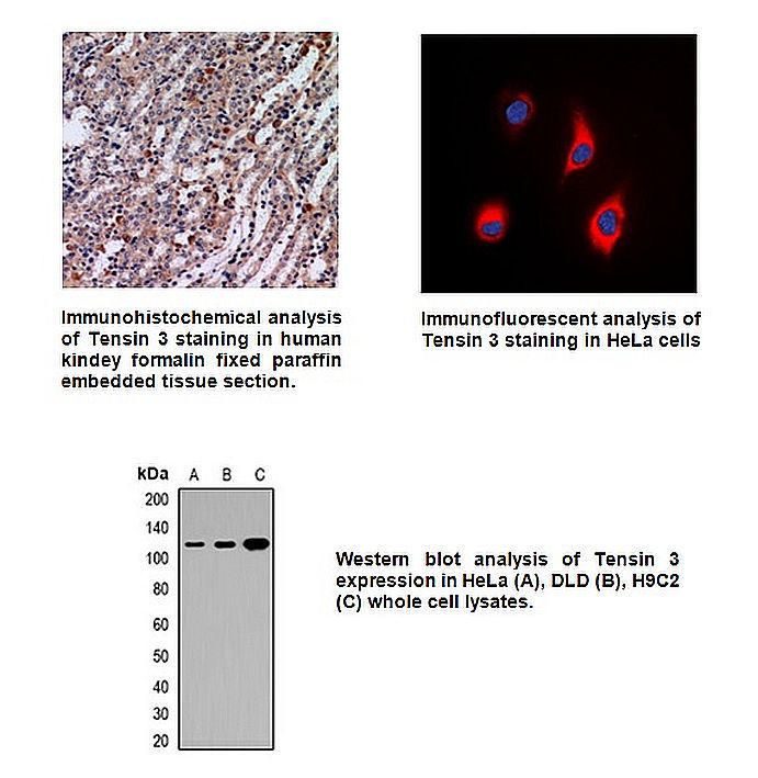 Tensin 3 Polyclonal antibody 100ul^ Tensin 3 Polyclonal antibody, Host: Rabbit, Species: Human, Rat, Isotype: IgG, Immunogen: Synthetic peptide encompassing a sequence within the center region of human Tensin 3, Synonyms: TEM6, TENS1, TPP, Tensin-3, Application: WB, IH, IF/IC, Size: 100ul