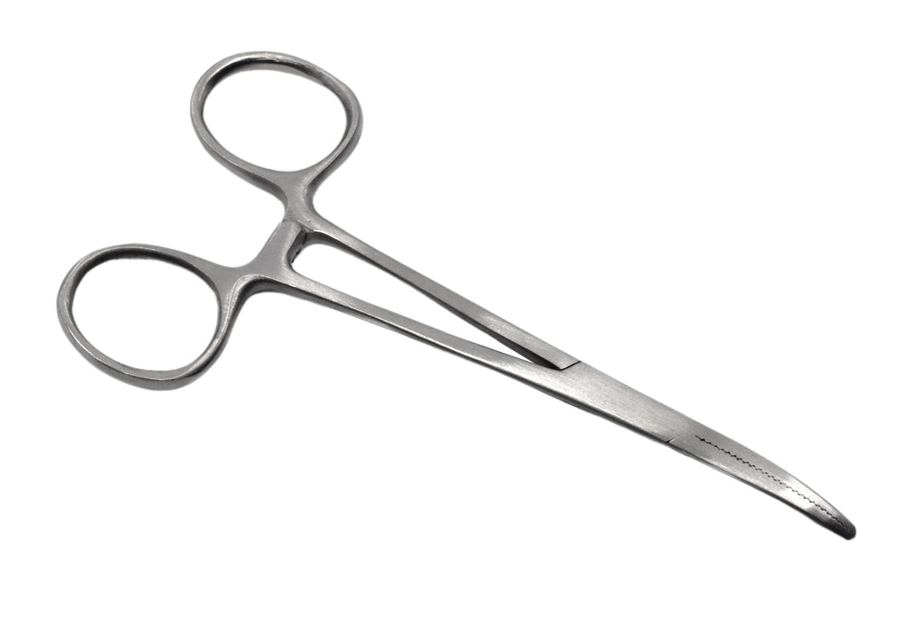 Forceps with curved jaws, box joint and scissor handles. Forceps measure 5 inches in total length. Forceps jaws feature serrated tips for a strong and precise grip. Made of stainless steel. Designed for use in educational laboratories. Not sterile, and NOT intended for human or medical use of any kind.