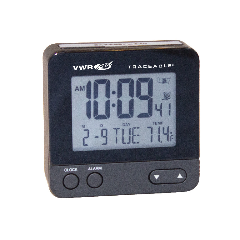 Radio-Controlled Atomic Clocks are extremely accurate, to 1/10000 of a second., Radio signal automatically adjusts for AM/PM, 24-hour time, day/date, and daylight savings time. Atomic clocks are ideal for recording the receiving of samples, noting the exact time an event occurred, supporting documentation, providing a standard for a location’s other clocks, maintaining ISO 9000 certification, and for the myriad of occasions when knowing the exact time is immensely valuable., 04_BodyText: Traceable® Products have an individually-numbered Traceable® Certificate provided with each unit, that assures accuracy from an ISO/IEC 17025:2017(1750.01) calibration laboratory accredited by A2LA. It indicates traceability of measurements to the SI units through NIST or other recognized national measurement institutes (NMI) that are signatories to the CIPM Mutual Recognition Agreement. Each product goes through an intense vetting process before it can carry the Traceable name, thus saving time and money by not having to calibrate separately., 05_BodyText: Temperature range 23 to 122 °F (−5 to 50 °C) | Temperature resolution 0.1 °C, 02_BulletPoint: Clear display with elegant acrylic lens shows a resolution of 1 second | Displays time, calendar, and weekday | Reads indoor temperature (°C/°F) | Offers alarm and snooze function | Use an amber LED backlight for daytime use and an auto-night light function for night viewing, 08_Certifications: NIST-traceable calibration certificate with data included., 10_Ordering: The Mini Bench-Top Atomic clock requires two (2) AAA batteries for operation. The standard Bench-Top Atomic clock requires two (2) AA batteries for operation., VWR® Traceable® mini bench-top atomic clock, 1 s resolution, Cat. No.: 76491-716, W×H×D: 6.35×6.35×2½4 cm (2½×2½×1"), Final SAP Desc Link: 6904348, SAP Description Status: Ready, Radio-Controlled Atomic Clocks are extremely accurate, to 1/10000 of a second., Radio signal automatically adjusts for AM/PM, 24-hour time, day/date, and daylight savings time. Atomic clocks are ideal for recording the receiving of samples, noting the exact time an event occurred, supporting documentation, providing a standard for a location’s other clocks, maintaining ISO 9000 certification, and for the myriad of occasions when knowing the exact time is immensely valuable., 04_BodyText: Traceable® Products have an individually-numbered Traceable® Certificate provided with each unit, that assures accuracy from an ISO/IEC 17025:2017(1750.01) calibration laboratory accredited by A2LA. It indicates traceability of measurements to the SI units through NIST or other recognized national measurement institutes (NMI) that are signatories to the CIPM Mutual Recognition Agreement. Each product goes through an intense vetting process before it can carry the Traceable name, thus saving time and money by not having to calibrate separately., 05_BodyText: Temperature range 23 to 122 °F (−5 to 50 °C) | Temperature resolution 0.1 °C, 02_BulletPoint: Clear display with elegant acrylic lens shows a resolution of 1 second | Displays time, calendar, and weekday | Reads indoor temperature (°C/°F) | Offers alarm and snooze function | Use an amber LED backlight for daytime use and an auto-night light function for night viewing, 08_Certifications: NIST-traceable calibration certificate with data included., 10_Ordering: The Mini Bench-Top Atomic clock requires two (2) AAA batteries for operation. The standard Bench-Top Atomic clock requires two (2) AA batteries for operation., VWR® Traceable® bench-top atomic clock, 1 s resolution, Cat. No.: 76491-718, W×H×D: 10.16×7.62×3.175 cm (4×3×1¼"), Final SAP Desc Link: 6904348, SAP Description Status: Ready, Radio-Controlled Atomic Clocks are extremely accurate, to 1/10000 of a second., Radio signal automatically adjusts for AM/PM, 24-hour time, day/date, and daylight savings time. Atomic clocks are ideal for recording the receiving of samples, noting the exact time an event occurred, supporting documentation, providing a standard for a location’s other clocks, maintaining ISO 9000 certification, and for the myriad of occasions when knowing the exact time is immensely valuable., 04_BodyText: Traceable® Products have an individually-numbered Traceable® Certificate provided with each unit, that assures accuracy from an ISO/IEC 17025:2017(1750.01) calibration laboratory accredited by A2LA. It indicates traceability of measurements to the SI units through NIST or other recognized national measurement institutes (NMI) that are signatories to the CIPM Mutual Recognition Agreement. Each product goes through an intense vetting process before it can carry the Traceable name, thus saving time and money by not having to calibrate separately., 05_BodyText: Temperature range 23 to 122 °F (−5 to 50 °C) | Temperature resolution 0.1 °C, 02_BulletPoint: Clear display with elegant acrylic lens shows a resolution of 1 second | Displays time, calendar, and weekday | Reads indoor temperature (°C/°F) | Offers alarm and snooze function | Use an amber LED backlight for daytime use and an auto-night light function for night viewing, 08_Certifications: NIST-traceable calibration certificate with data included., 10_Ordering: The Mini Bench-Top Atomic clock requires two (2) AAA batteries for operation. The standard Bench-Top Atomic clock requires two (2) AA batteries for operation., Final SAP Desc Link: 6904348, SAP Description Status: Ready
