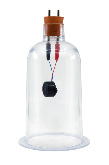 The Bell in Vacuum Experiment is a classic physics demonstration that uses an audible buzzer in a vacuum to show how sound waves require a medium through which to travel. This experiment is a great way for students to learn about the properties and dependencies of mechanical waves. The set includes an acrylic bell jar, a rubber stopper fitted with lead plugs, and an electric buzzer. As air is removed from the closed system inside the bell jar, the sound of the buzzer becomes proportionately fainter. To conduct the experiment, a vacuum plate, vacuum pump, and 3-6V DC power source are required but not supplied. Size of bell jar: 10"H x 5.7" dia.