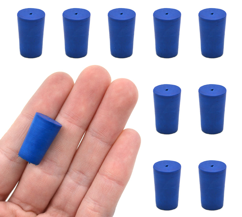 Pack of 10 stoppers made of neoprene rubber. Each stopper has a single hole measuring 5mm in diameter. Blue color. Each stopper measures 20mm in length, has a base diameter measuring 10mm, and a top diameter measuring 12.5mm. The neoprene rubber construction is suitable for use with petroleum products, minerals, oils and fats, as well as most inorganic acids and bases. Resistant to temperatures ranging from -40 to 130°C.