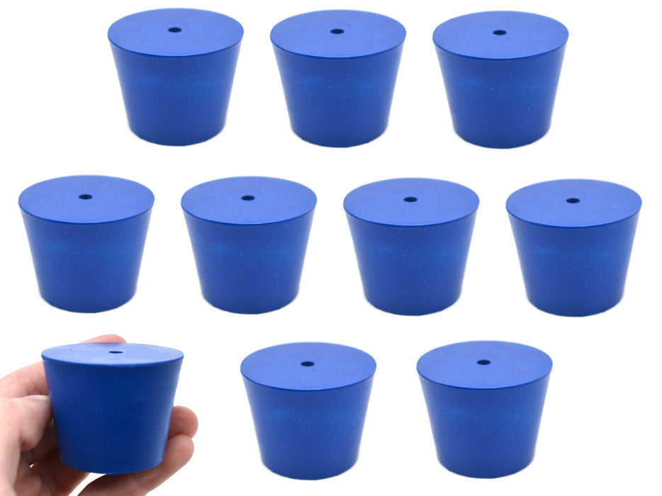 Blue neoprene stoppers with 1 hole (5 mm dia): Bottom 35mm Top 45mm Length 36mm Made from long lasting neoprene rubber, oil resistant, Use up to temps of 250°F / 120°C , Pack of 10