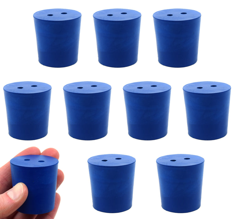 Pack of 10 stoppers made of neoprene rubber. Each stopper has 2 holes measuring 5mm in diameter. Blue color. Each stopper measures 38mm in length, has a base diameter measuring 33mm, and a top diameter measuring 38mm. The neoprene rubber construction is suitable for use with petroleum products, minerals, oils and fats, as well as most inorganic acids and bases. Resistant to temperatures ranging from -40 to 130°C.