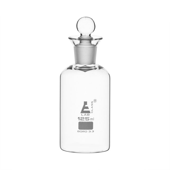 125ml B.O.D. borosilicate glass bottle with stopper. Bottle stands 4.52" in height and is 2" in diameter. Autoclavable, with superior chemical durability. Low temperature gradient- can withstand high temperatures & thermal shocks. Eisco Labs Borosilicate glass has the following heat tolerances: Strain Point -515°C | Annealing Point 565°C | Softening Point 820°C.