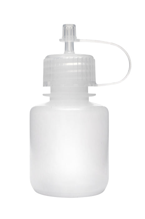 This unique low density polyethylene dropping bottle comes with a screw cap and dropper nozzle that allows for small, uniform drops of liquid to be dispensed. Attached cover prevents spilling.Bottle has a 30ml (1oz) capacity. Measures 3" tall and 1.4" in diameter. Made of translucent LDPE plastic.