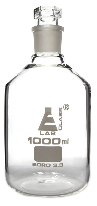 Here is the corrected text: This 1000ml reagent bottle is made of high-quality borosilicate glass and features a narrow mouth with an interchangeable hexagonal hollow stopper. The socket size is 29/32, and the bottle stands 9 inches tall and 4 inches in diameter. Designed for use in science laboratories, it can also be used in homes or garages. Made from heavy-duty borosilicate glass, this reagent bottle has excellent heat tolerance, with a strain point of 515°C, an annealing point of 565°C, and a softening point of 820°C.