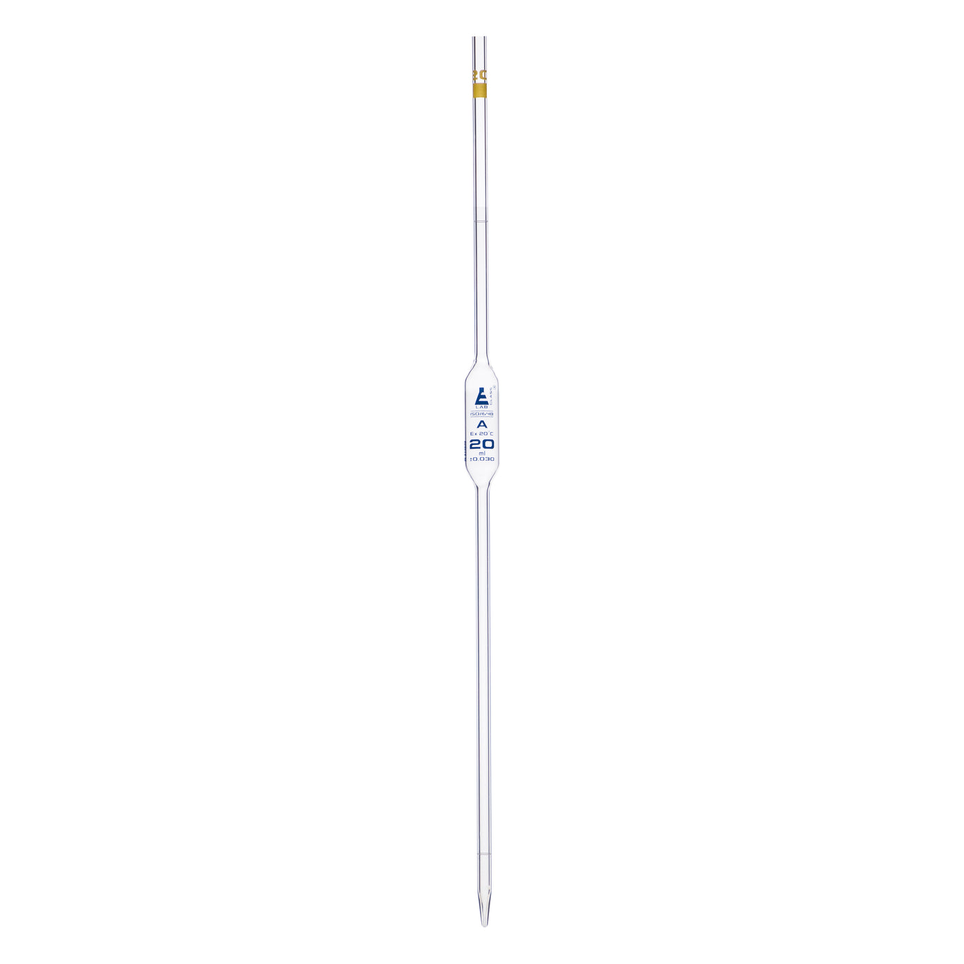 Bulb Form Pipette, 20ml. Class A, Tolerance ±0.030. Two, white graduation lines. Color Code: Yellow. Made of high quality, heavy duty Borosilicate 3.3 Glass.