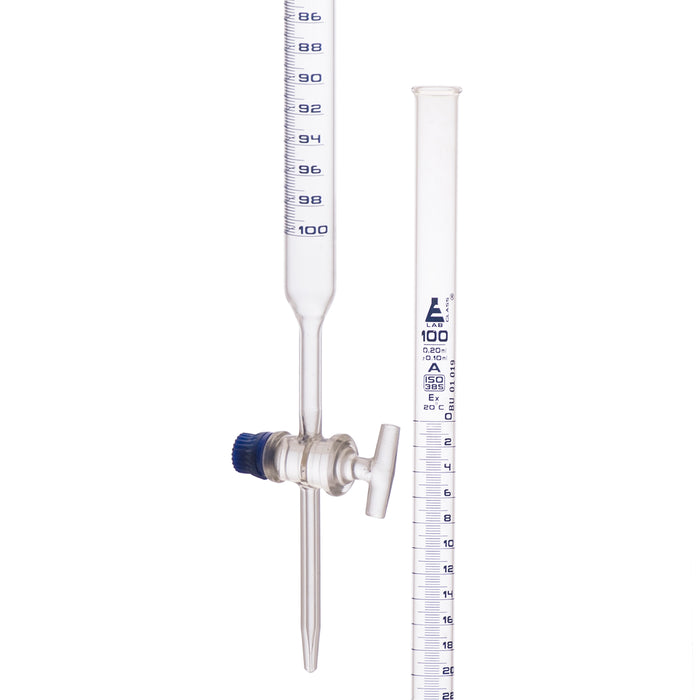 Here is the corrected text: • Burette with a 100ml capacity • Class A, with a ±0.10mL tolerance and 0.20mL subdivisions - Accurate according to Class A standards, compliant with DIN ISO 385 • Includes an attached key stopcock made of high-quality glass • The burette is made of precisely bored, high-quality, heavy-duty Borosilicate 3.3 glass, built to last • Features chemical-resistant blue printing • All contents are included in a single package • Class A accuracy as per DIN ISO 385 standard • The burette is made of high-quality 3.3 borosilicate glass • Glass key stopcock • Capacity: 100ml; Subdivisions: 0.20mL; Tolerance: ±0.10mL • Eisco Labs Borosilicate glass has the following heat tolerances: Strain Point, 515°C; Annealing Point, 565°C; Softening Point, 820°C • Calibrated for delivery.