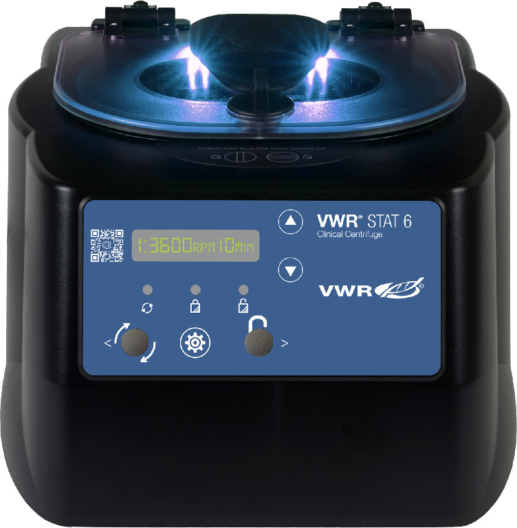 VWR STAT clinical benchtop centrifuges spin samples in 5 minutes or less for the most urgent chemistry and haematology testing., The VWR STAT 6 introduces the flexible controls and digital display of the best-selling STAT 12 to a smaller body, saving you valuable bench space and allowing you to customise cycle parameters based on your IFUs and unique validation needs. Prevent forgotten samples and reduce TAT with LED lid lighting. Bright lights indicate when the centrifuge is ready to load (off), running (on), or done (flashing). Lights continue flashing until the lid is opened. Set and save up to 10 programmable time, speed, and g-force settings using the user-friendly interface. The VWR STAT 6 arrives pre-programmed with the most common STAT settings and can spin 75 to 100 mm (3 to 10 ml) tubes with the same rotor and universal tube holders., 02_BulletPoint: Digital display shows remaining spin time and custom parameters | Max speed 5300 min⁻¹ (rpm)/4000×g | LED lid lights indicate cycle status (off when ready, on when running, and flashing when done), preventing forgotten tubes and reducing TAT | Up to 10 custom cycles can be programmed in memory for acceleration, deceleration, speed, g-force, and runtime | Arrives pre-programmed with 3 common STAT settings | Spin up to 6 tubes (75 to 100 mm/3 to 10 ml) out of the box, no additional accessories needed | 2 year warranty (lifetime on rotor), 08_Certifications: MET, UKCA., 11_Delivery: Each centrifuge is supplied ready to run with rotor, tube holders, QR code manual and quick start guide. Microtainer tube adapters must be ordered separately., Final SAP Desc Link: 4633299, SAP Description Status: Ready, Max. Capacity: 6×100 mm (up to 10 ml) tubes, Max. Speed: 5300 rpm, VWR STAT clinical benchtop centrifuges spin samples in 5 minutes or less for the most urgent chemistry and haematology testing., The VWR STAT 6 introduces the flexible controls and digital display of the best-selling STAT 12 to a smaller body, saving you valuable bench space and allowing you to customise cycle parameters based on your IFUs and unique validation needs. Prevent forgotten samples and reduce TAT with LED lid lighting. Bright lights indicate when the centrifuge is ready to load (off), running (on), or done (flashing). Lights continue flashing until the lid is opened. Set and save up to 10 programmable time, speed, and g-force settings using the user-friendly interface. The VWR STAT 6 arrives pre-programmed with the most common STAT settings and can spin 75 to 100 mm (3 to 10 ml) tubes with the same rotor and universal tube holders., 02_BulletPoint: Digital display shows remaining spin time and custom parameters | Max speed 5300 min⁻¹ (rpm)/4000×g | LED lid lights indicate cycle status (off when ready, on when running, and flashing when done), preventing forgotten tubes and reducing TAT | Up to 10 custom cycles can be programmed in memory for acceleration, deceleration, speed, g-force, and runtime | Arrives pre-programmed with 3 common STAT settings | Spin up to 6 tubes (75 to 100 mm/3 to 10 ml) out of the box, no additional accessories needed | 2 year warranty (lifetime on rotor), 08_Certifications: MET, UKCA., 11_Delivery: Each centrifuge is supplied ready to run with rotor, tube holders, QR code manual and quick start guide. Microtainer tube adapters must be ordered separately., STAT 6, programmable STAT centrifuge, with digital display and programmable cycles, Rotor type: Horizontal, Electrical: 95 - 253 VAC, 50/60 Hz, Max. RCF: 4000×g, Dimensions: 30.5×35.6×22.9 cm (12×14×9"), Weight: 5.5 kg (12 lbs.), Cat. No.: 77553-264, Final SAP Desc Link: 4633299, SAP Description Status: Ready