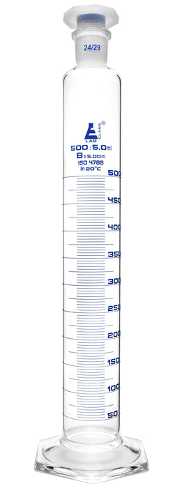 This Class B measuring cylinder is made of high-quality borosilicate glass and features an interchangeable 24/23 polypropylene stopper. It has a capacity of 500ml, with 5ml graduation lines marked every 50ml, displayed in blue. The cylinder stands 15.5 inches tall and has a stable hexagonal base that measures 4 inches in diameter.