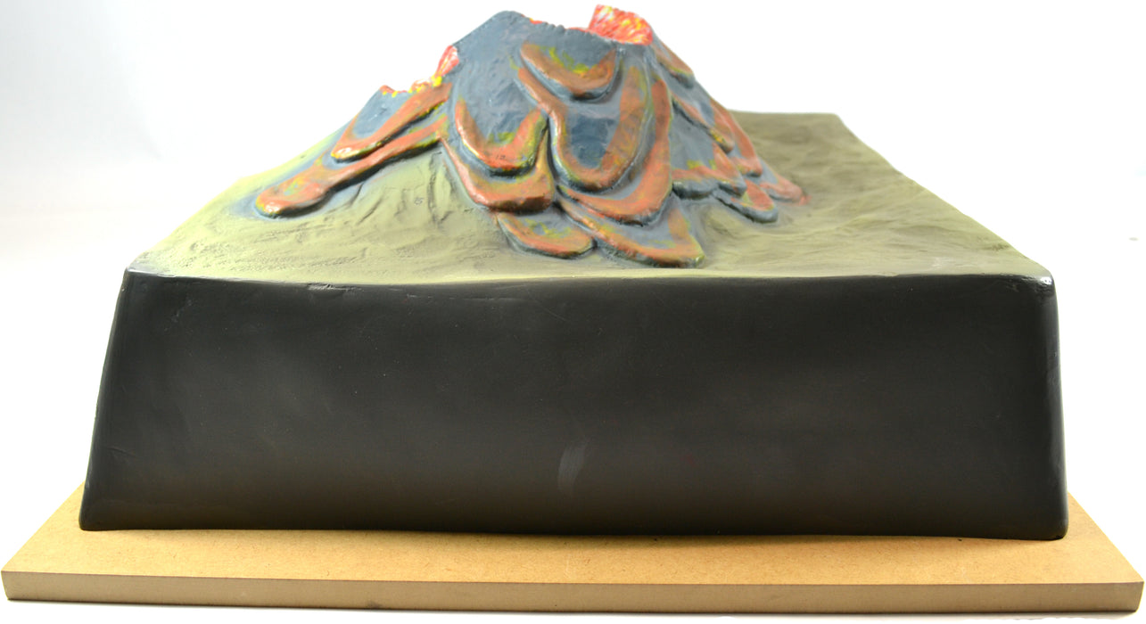 This table-top model of an active volcano is cut away to show its internal structures, including the magma chamber, vent, side vents, sills, and crater, as well as rock layers and surrounding terrain. Mounted on a base, it features numbered labels with an included key card for easy identification of its various features. Crafted by subject matter experts, this model boasts vibrant, hand-painted details using eco-friendly paint. Designed as a visual learning aid for introducing volcanoes, volcanology, and the effects of volcanic activity on the Earth, it measures 17" x 16" x 7".