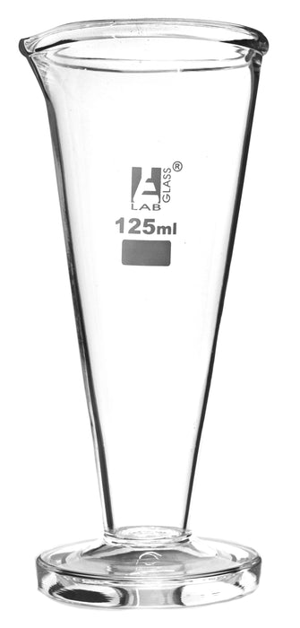 This conical measure features a 125ml capacity, a spout for easy pouring, and is made of high-quality borosilicate glass with a round base and no graduation lines. It stands 6.5 inches tall. Eisco Labs' borosilicate glass has the following heat tolerances: strain point -515°C, annealing point 565°C, and softening point 820°C.