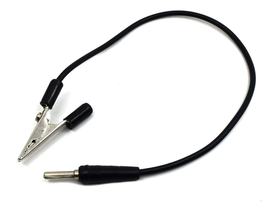 Insulated, black connecting lead. One end features an alligator style clamp, other end features 4mm plug. Lead measures 12" long