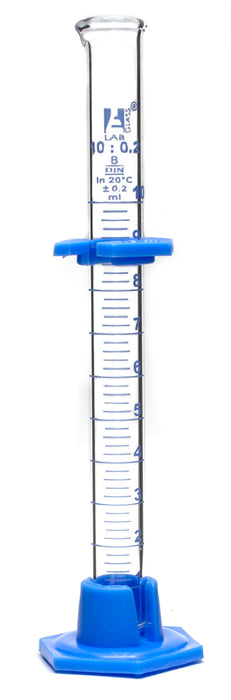Borosilicate glass graduated cylinder included with plastic guard. Plastic detachable Hexagonal base. Capacity 10ml / 0.2ml graduations. Sold as an eachEisco Labs Borosilicate glass has the following heat tolerances: Strain Point -515°C | Annealing Point 565°C | Softening Point 820°C.