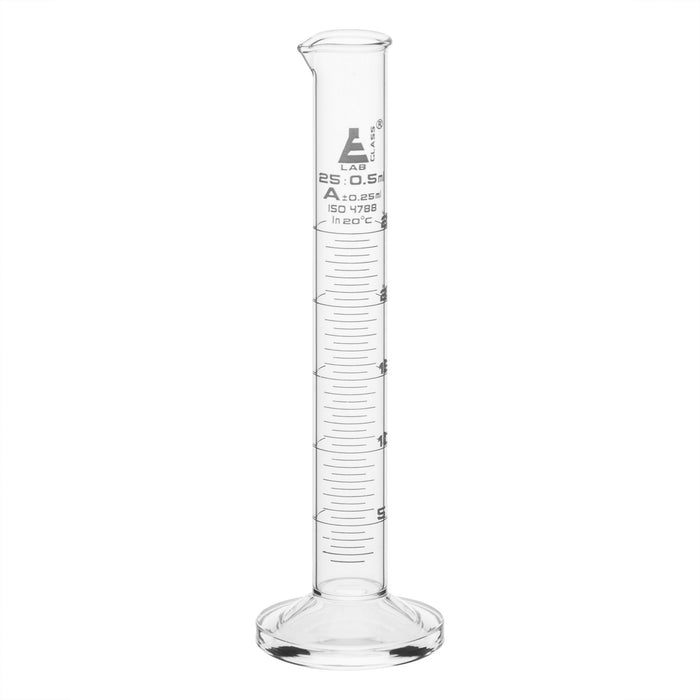 ull; 25ML GRADUATED CYLINDER || Includes a 25ml capacity measuring cylinder made of borosilicate glass with a round base and spout, ideal for precise liquid measurement. • CLASS A ACCURACY || ISO 4788 certified, offering high precision with Class A accuracy, making it suitable for professional and academic laboratory use. • CLEAR WHITE GRADUATIONS || Features white graduations for easy-to-read volume measurements, ensuring accurate data collection in experiments. • PRACTICAL DESIGN || Round base ensures stability during use, and the spout facilitates easy pouring, making it convenient for various lab applications. • VERSATILE USE || Perfect for use in chemistry labs, research facilities, and educational institutions for conducting experiments, mixing, and measuring liquids. The Eisco Labs 25ml Graduated Measuring Cylinder is an essential tool for precise liquid measurement in scientific settings. Made from borosilicate glass and ISO 4788 certified, it features Class A accuracy, white graduations, a round base for stability, and a spout for easy pouring. Ideal for research, educational labs, and professional use.