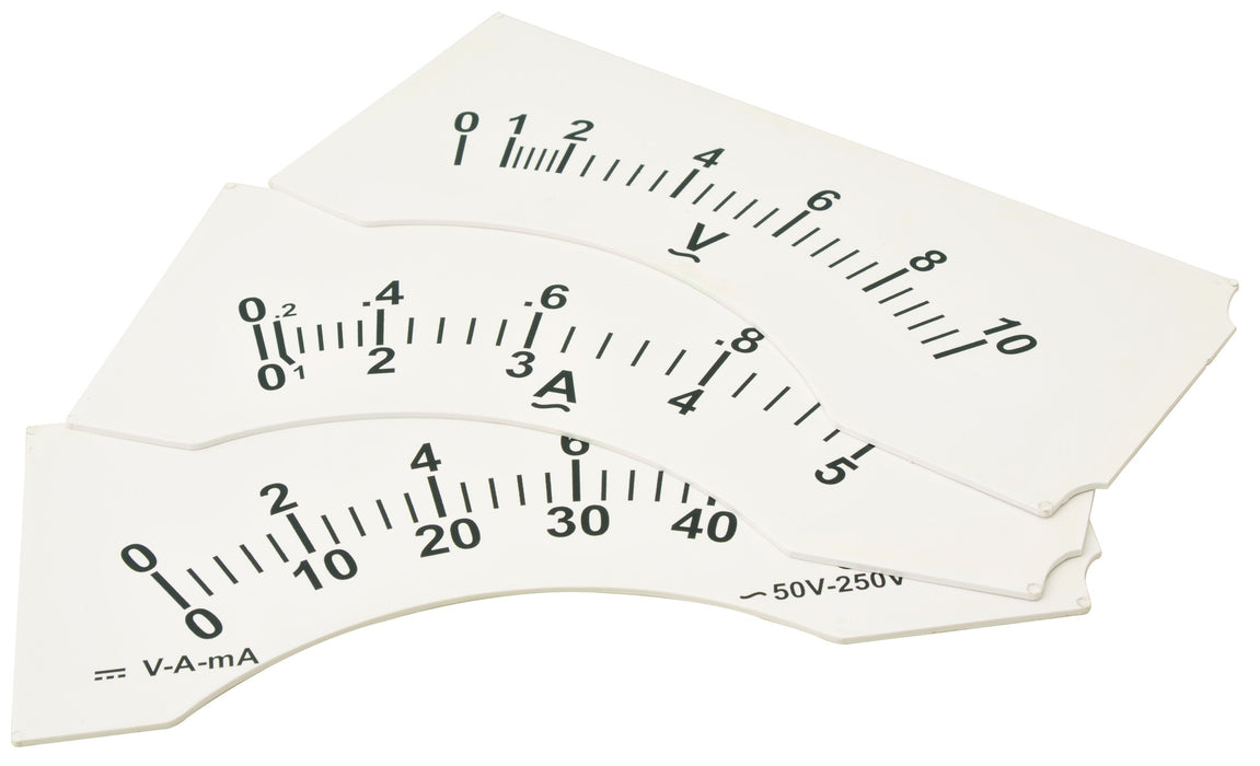 For use with PH - 1116. Each dial comprises a laminated plastic panel 315 x 115 mm with a sealed moulded box at one end which contains the shunt or voltage multiplier appropriate to the scale.
