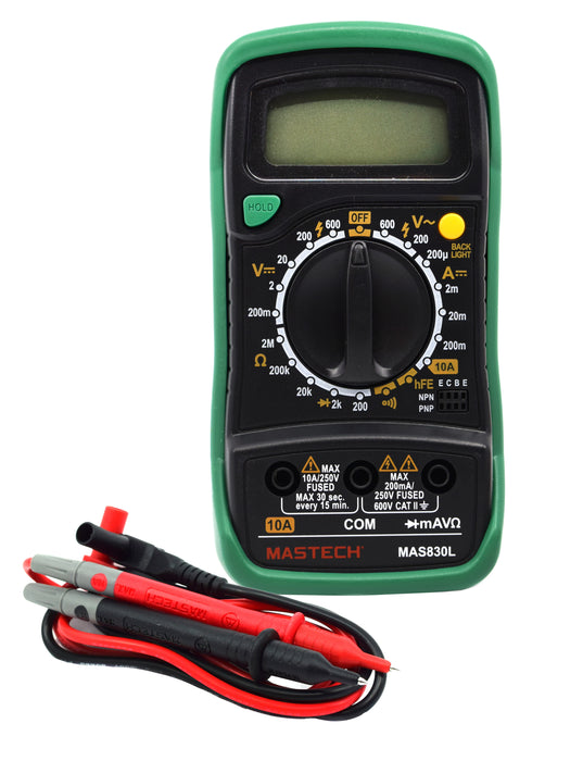 Handheld digital Multimeter with LCD display and drop resistant case. Includes battery, 2 testing leads and instructions manual. Stable and reliable. Features a 15mm LCD display for clear reading. The circuit design takes LSI double integral A/D converter as its core under the protection of an overload protection circuit, making it a superior and handy instrument. Can be used to measure DC and AC voltage, DC current, resistance, transistors, diodes and for in-circuit continuity testing. Unit measures 5.4" tall, 2.7" wide and 1.2" long.