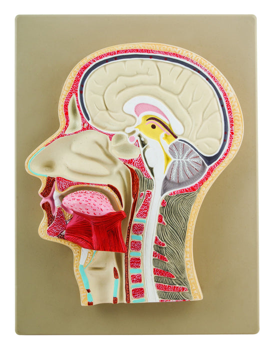 This premium model showcases half of the human head, featuring the median section, brain, nose, mouth, pharynx, larynx, and vertebral column of the neck in lifelike size. The intricately hand-painted details are precise and beautiful. For easy identification, the parts are numbered and accompanied by an included key card. Mounted on a wooden base measuring 13" long, 10" wide, and 1" tall, the head model itself measures 10" long, 8" wide, and 1" tall.