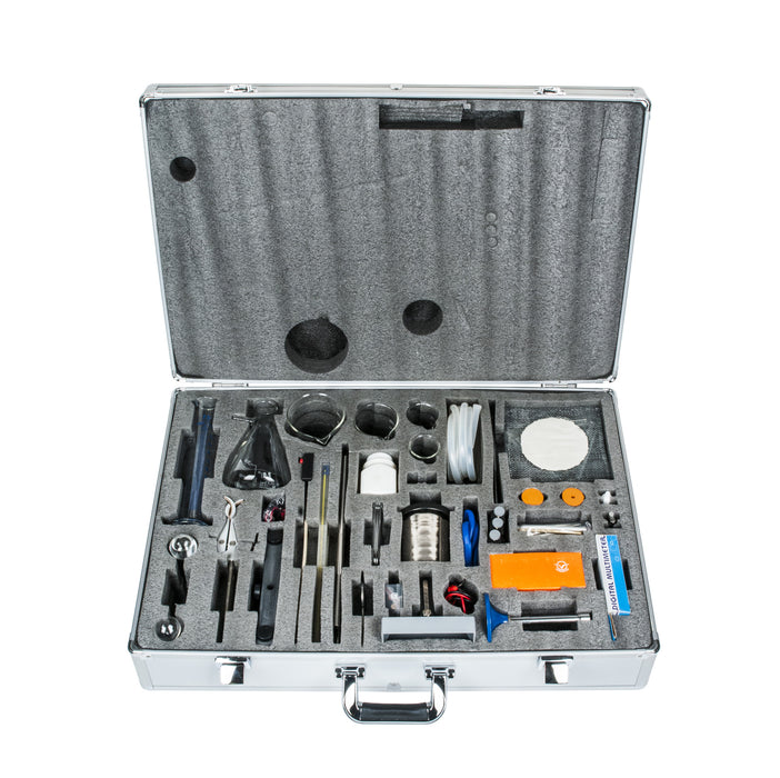 The Heat System Physics Kit comes with 54 components, including all the thermometers, beakers, tubes, and vessels needed to investigate core concepts in introductory thermodynamics. With this kit, students can explore common experiments such as Newton's Law of Cooling, Specific Heat, and the expansion of solids, liquids, and gases. The kit includes an Experiment Guide covering 15 activities: Psychrometry; The Hot Tea Problem: Newton's Law of Cooling; Specific Heat of Several Metals; Specific Heat of Water; Expansion of Water; Heat of Fusion; Linear Expansion of a Solid; Phase Transitions and Cooling Curves; Heat Conduction in a Rod; Convective Heat Transfer; Pulse Glass; Expansion of Gas; Expansion of Liquid; The Thermocouple; and The Thermostat.