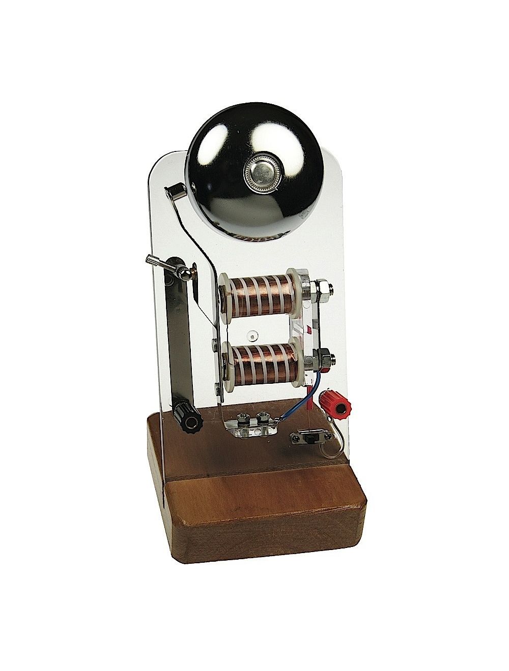 This well-constructed and attractive electric bell model is mounted on a clear acrylic plate and finished wooden stand, allowing the functional parts to be clearly seen. The model operates on 6V DC and features an on/off switch, an adjustable contact screw, and binding posts for easy connection. It also includes an activity guide.