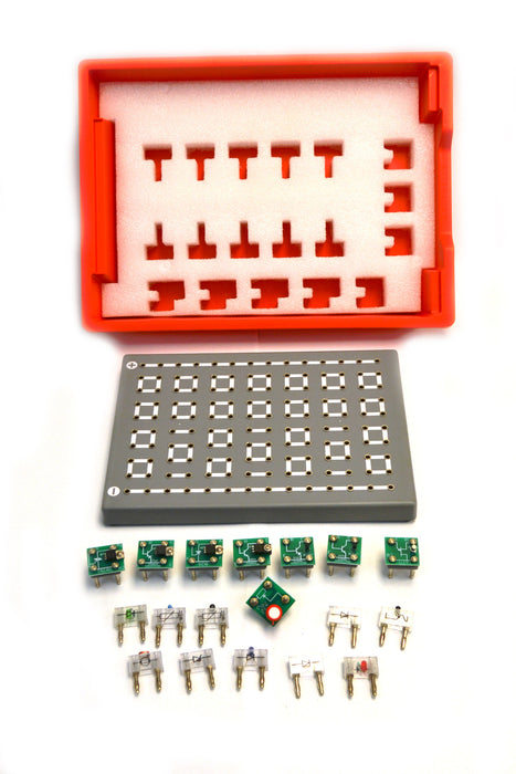 ull; Electronics systems kit allows multiple electronic samples to be build for educational proposes. • Electronics kit comes with plastic case and lid to keep all contents organized. • Endless Topics can be taught, great equipment kit to outfit a new physics classroom or boast an old one Includes: 1 Systems kit Electronics systems kit allows to following: Build a forward basis diode Build a half wave rectifier Build a Zener Diode Using a transistor as a switch Measuring power gain with a PNP power transistor Infrared Diode and Phototransistor Light Dependent Transistor Temperature Dependent Resistors Silicon Controled Rectifier TRIAC - Thyristor Contains the following pieces along with plastic case with lid: Board for Electricity and Electronics 1 Si Diode 2 Zener Diode 1 Red LED Diode 1 Green LED Diode 1 Infrared (IR) Diode 1 Photoresistor 1 Light Dependent Resistor (LDR) 1 NTC Resistor 1 PTC Resistor 1 NPN signal transistor 1 PNP signal transistor 1 NPN power transistor 1 PNP power transistor 1 Silicon Controlled Resistor (SCR) 1 TRIAC 1 Unijunction transistor (UJT) 1