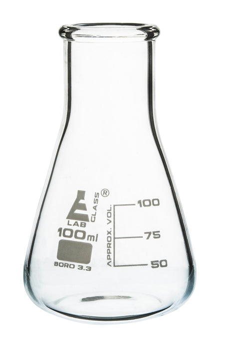• High-quality borosilicate glass • Single 100ml Wide Neck Glass Erlenmeyer Flask • Eisco Labs' borosilicate glass features the following heat tolerances: strain point, -515°C; annealing point, 565°C; and softening point, 820°C.
