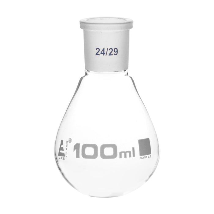 Made of high-quality, heavy-duty Borosilicate 3.3 glass, this 100ml capacity round-bottom evaporating flask is perfect for any science or home laboratory. It features a single, interchangeable 24/29 size joint socket and stands 4.25 inches tall with a diameter of 2.5 inches at its widest point. Please note that no stopper is included. This autoclavable flask boasts superior chemical durability and can withstand high temperatures and thermal shocks due to its low temperature gradient. The Eisco Labs Borosilicate glass has the following heat tolerances: strain point, 515°C; annealing point, 565°C; and softening point, 820°C. Eisco Labs proudly manufactures its own products using state-of-the-art equipment and adheres to the highest standards of quality control. A team of laboratory professionals and experienced engineers carefully designs each product with quality and durability in mind. They are manufactured with only the highest-grade raw materials according to international quality standards, ensuring they can withstand use in even the toughest laboratory environments.