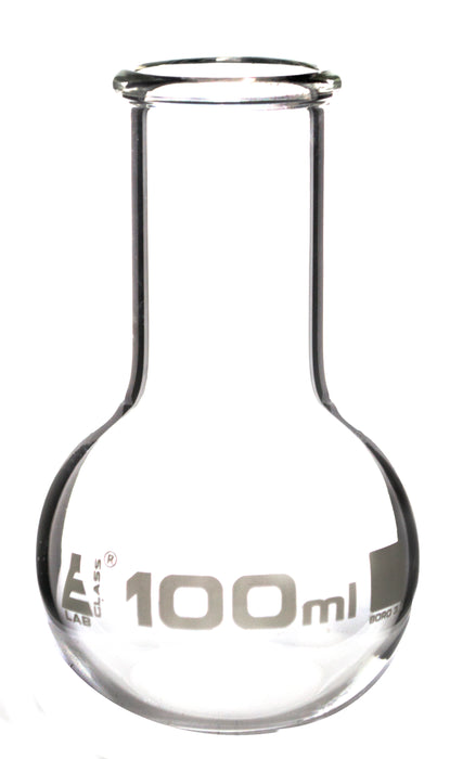 This premium flat-bottom, wide-neck boiling flask is made of heavy-duty Borosilicate 3.3 glass and has a capacity of 100mL. The flat bottom design allows it to be placed securely on tables or other surfaces. Please note that this flask is not intended for measuring purposes, as it does not feature graduations. A stopper is not included with the item. Eisco Labs' Borosilicate glass boasts impressive heat tolerances: a strain point of 515°C, an annealing point of 565°C, and a softening point of 820°C.