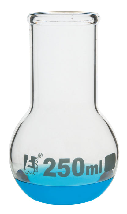 Here is the corrected text: Made of high-quality, heavy-duty borosilicate glass, this 250ml capacity Florence boiling flask features a wide neck, beaded rim, and flat bottom. Measuring 5.25" tall, with a 3.25" bottom diameter, 3" neck length, and 1.75" neck diameter, it is perfect for any science or home laboratory setting. Please note that no stopper is included. Eisco Labs borosilicate glass has the following heat tolerances: strain point -515°C, annealing point 565°C, and softening point 820°C.