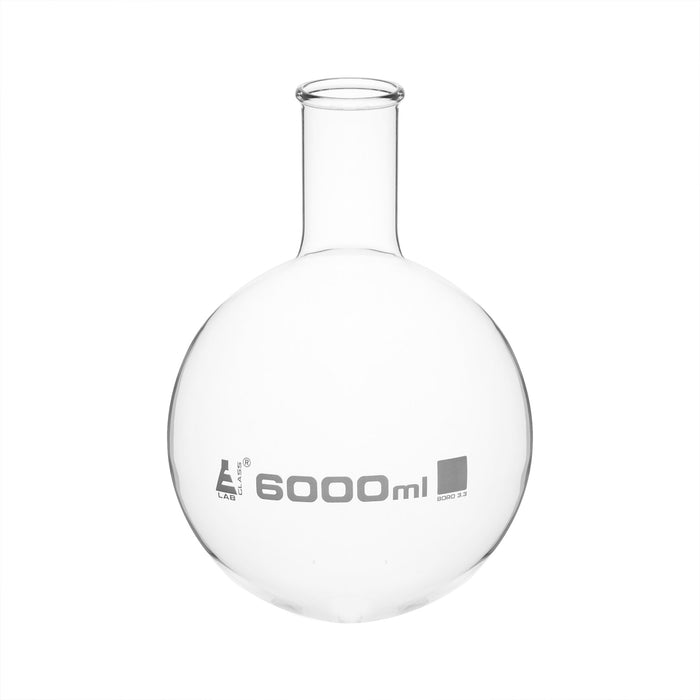 6,000 mL capacity boiling flask made from high quality, heavy duty borosilicate 3.3 glass. Round bottom for more uniform boiling and heating of liquids. Flask features a narrow neck measuring 4" in total length, and a beaded rim. The inner diameter of the flask neck measures 2.3" (58mm) and it's outer diameter measures 2.5" (65mm). Flask stands 14.5" tall and is 9" in diameter at it's widest point.Autoclavable, with superior chemical durability. Low temperature gradient- can withstand high temperatures & thermal shocks. Eisco Labs Borosilicate glass has the following heat tolerances: Strain Point 515°C | Annealing Point 565°C | Softening Point 820°C