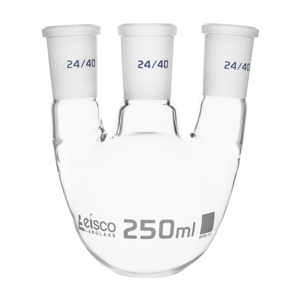 Round bottom distilling flask with three necks and standard ground joints Vertical center neck and two angled side necks Made from high quality borosilicate 3.3 glass conforming to USP Type-1 and ASTM E438, Type-1, Class-A requirements Excellent chemical resistance Mechanically strong with low temperature gradient Uniform wall thickness ideal for heating Autoclavable at 121 C